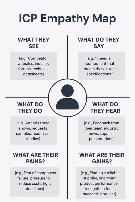 To create content that resonates, you must first understand your customer’s world. An ICP (Ideal Customer Profile) Empathy Map is a collaborative tool for capturing your customer’s pains, gains, and jobs-to-be-done. This document, created and shared by your sales, marketing, and engineering teams, becomes the single source of truth for all your content creation efforts.